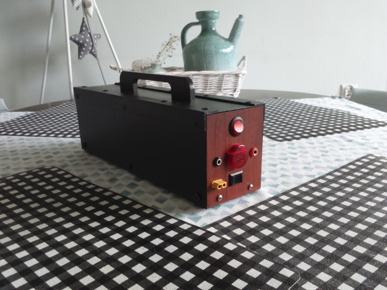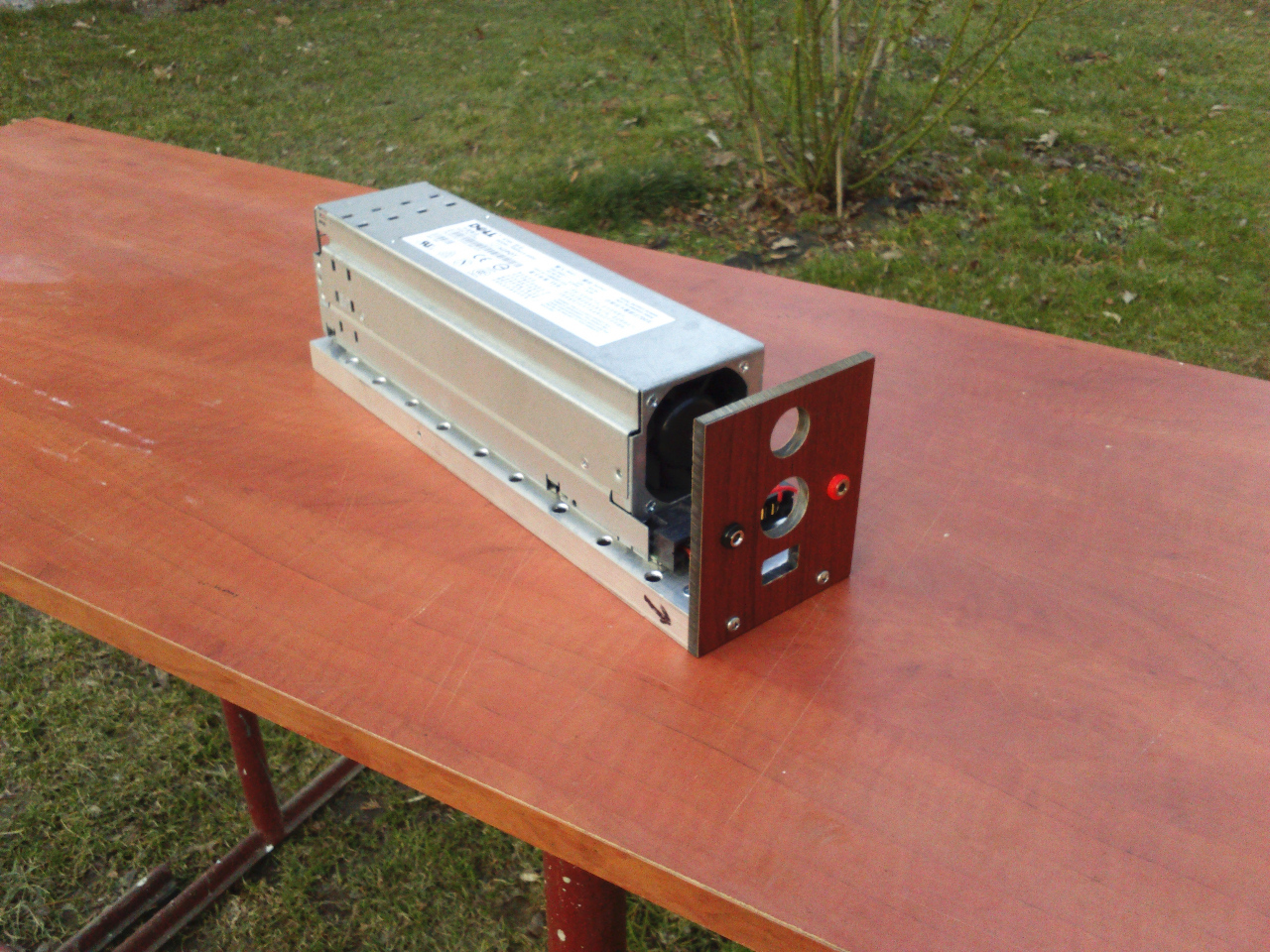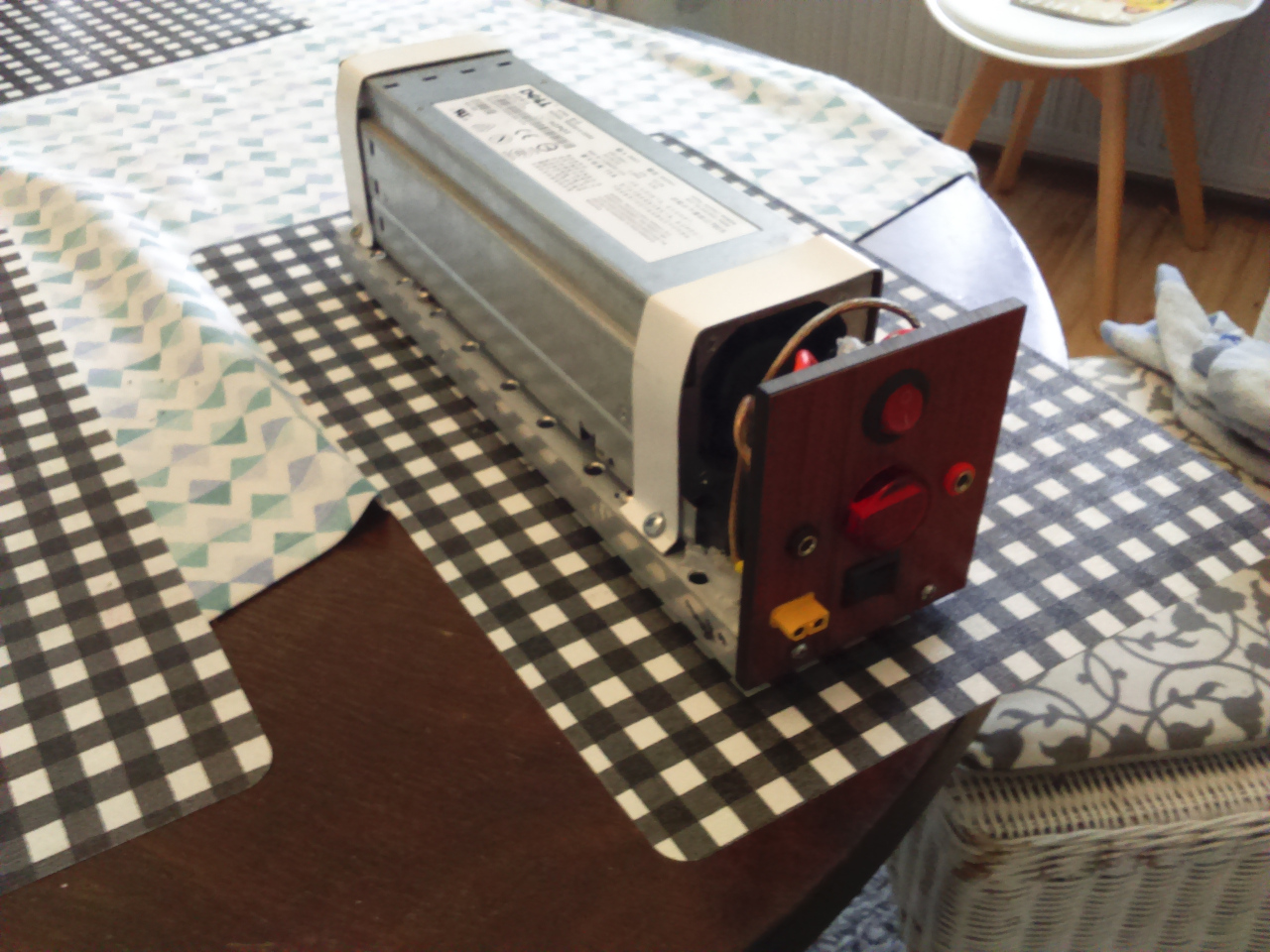 Najmocniejszy zasilacz który przerobiłem. Napięcie 12.5V, prąd 57.3A, moc 700W. Podwójne wyjście (banany 4mm 20A i XT60). 2 tryby pracy wentylatora. Konstrukcja z rury aluminiowej prostokątnej. Nawiercone otwory wentylacyjne (wentylator zasilacza wciąga powietrze od przodu). Cena: 0zł (części miałem, zasilacz ze złomu).